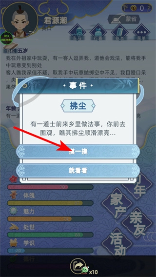 2、遇到拂尘事件时点击“摸一摸”,互动选择是触发探索奇遇的关键环节,完成选择后就能与道士的拂尘进行互动,进而获得特殊机缘并提升属性。