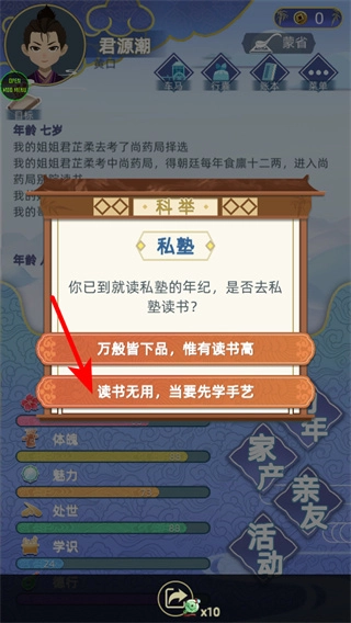 3、在面临私塾就读的选择时,若点击“读书无用”,主张先学手艺,那么发展选择便成为规划人生的关键环节,选定后就沿着手艺发展的路线前行,着重培养技能。