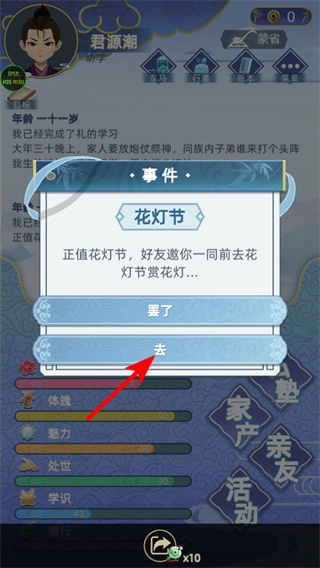 4、在收到花灯节邀请时选择“去”,这一社交选择是拓展人脉的关键操作,做出选择后就能参与花灯节活动,借此结识好友,逐步积累社交资源。