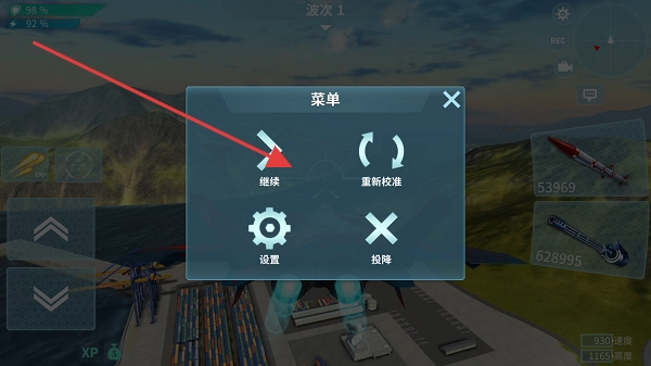 2、点击暂停按钮可唤出菜单界面,在该界面中,点击“继续”即可回到战斗状态,也能进行重新校准、设置等相关操作。