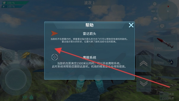 3、点击帮助按钮可查看游戏指引,比如跟随雷达箭头搜寻敌机,以及在靠近敌机时借助鹰眼系统来提高射击精准度。