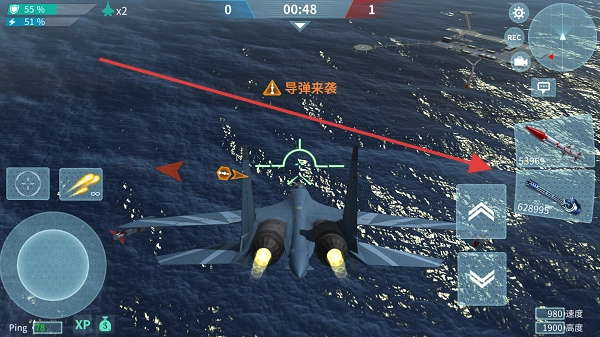 4、进入战斗界面后,注意观察屏幕上方的提示信息,若有导弹来袭,需通过虚拟摇杆控制飞机进行躲避,同时利用攻击按钮发起反击。
