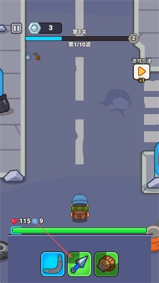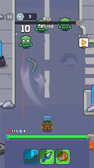 2、利用弯曲类武器对绿色僵尸发起攻击,以此减少它们的数量,从而抵挡其进攻。