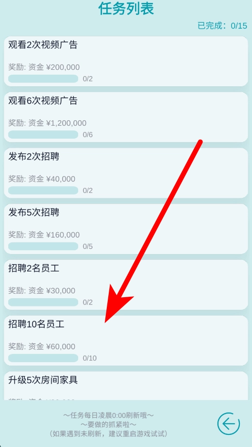 2、查看任务列表,其中包含观看视频、发布招聘、招聘员工、升级房间家具等各类任务,完成这些任务可获取资金奖励,助力酒店经营积累所需资源。