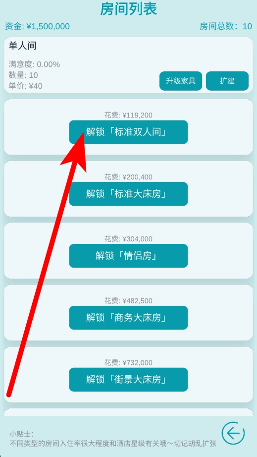 3、解锁客房需要消耗相应资金,从标准双人间到街景大床房这类不同房型,解锁之后能够增加酒店的客房类别,从而满足各类客人的住宿需求。