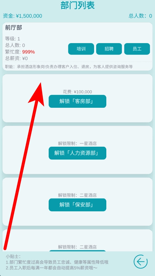 4、解锁部门需满足特定条件,例如客房部需要耗费资金来解锁,人力资源部、保安部等则设有酒店星级方面的限制。解锁部门有助于完善酒店的运营架构,进而提升其运营能力。
