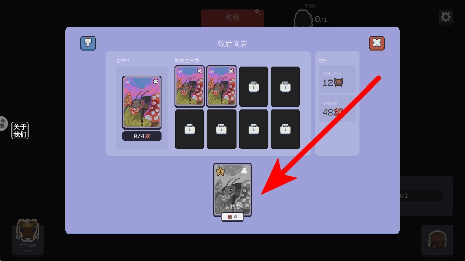 2、点击蚁后生产,进入蚁后商店,可挑选各类蚂蚁生产卡,利用蚁后相关的功能与资源,更高效地培育蚂蚁,增加蚂蚁的种类和数量。