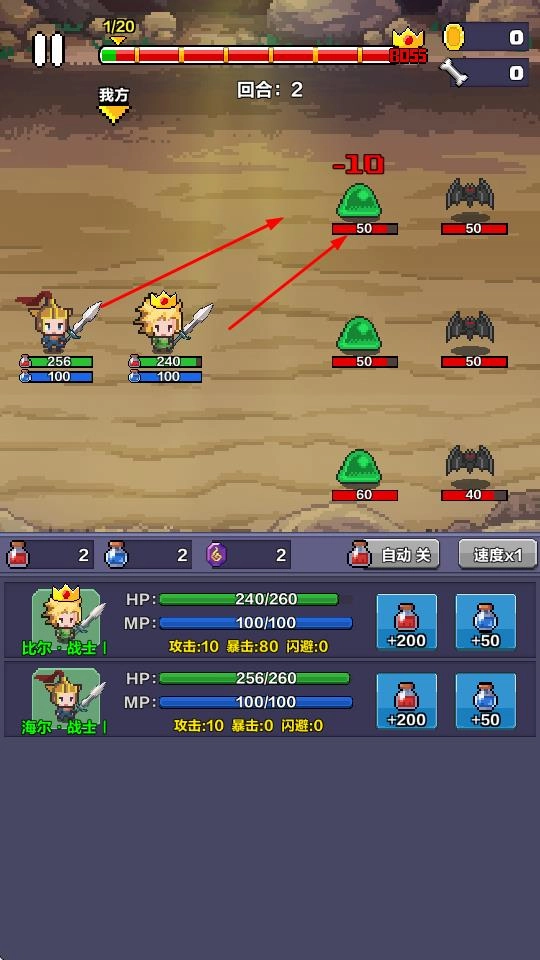1、操控比尔战士、海尔战士等角色,点击绿色史莱姆、蝙蝠等敌方怪物发起攻击。