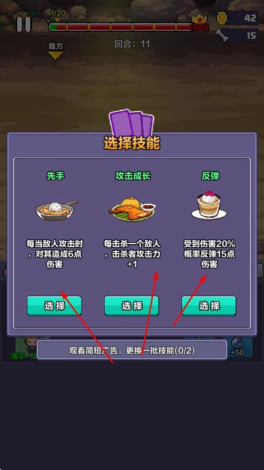 2、战斗过程中会弹出技能选择界面,你可以从中挑选先手、攻击成长、反弹等技能,以此来增强战斗能力。
