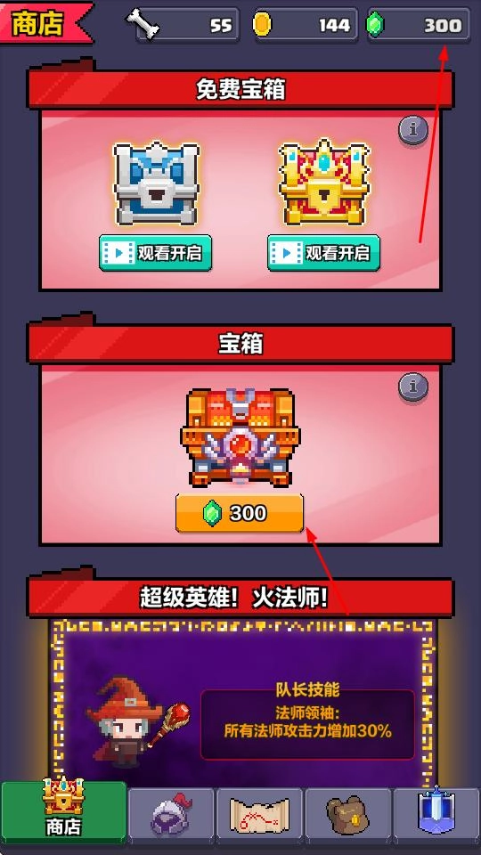 4、进入商店界面后,既可以通过观看广告来开启免费宝箱,也能够消耗绿宝石开启宝箱以获取奖励。