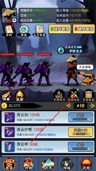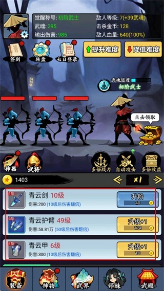 2、消耗金币升级装备,提升输出伤害,增强战斗能力。