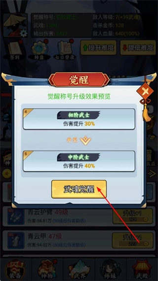 3、当武魂进度满后,点击武魂觉醒,升级觉醒称号,解锁更高伤害加成。