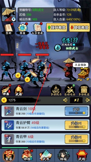 1、在游戏主界面通过攻击敌人积累武魂,同时可领取击杀金币奖励。