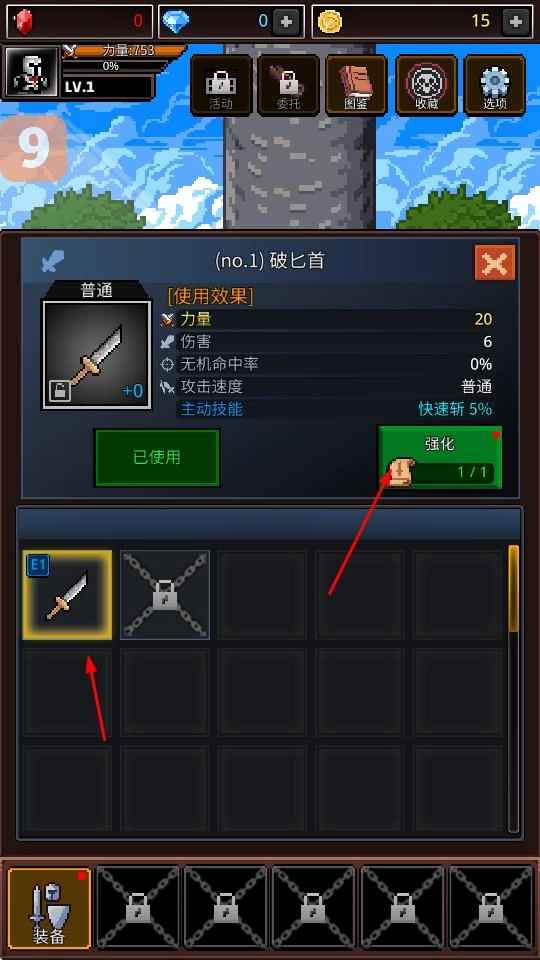 在装备界面中,你可以查看破匕首这类武器的属性,通过点击强化按钮来提升装备的能力,还能从装备栏里挑选武器进行使用。