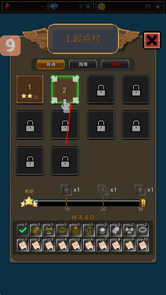 3、在关卡选择界面,可选择起点村等关卡,各关卡设有不同难度可供挑战,完成关卡后能够获得掉落的道具。