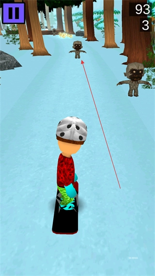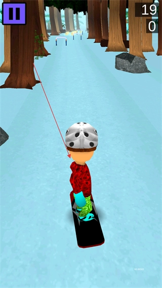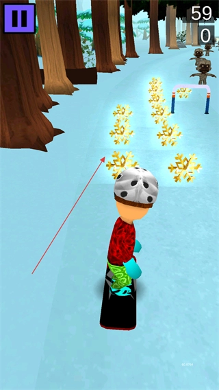 1、控制角色在雪地赛道上滑行,避开树木、石块之类的障碍,拾取沿途的物品。