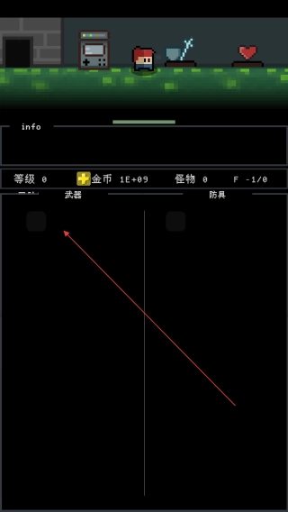2、点击下方按钮,在展开的选项里找到武器、护甲等装备栏,可通过探索地牢获取装备,也能用金币购买装备,以此提升角色实力。