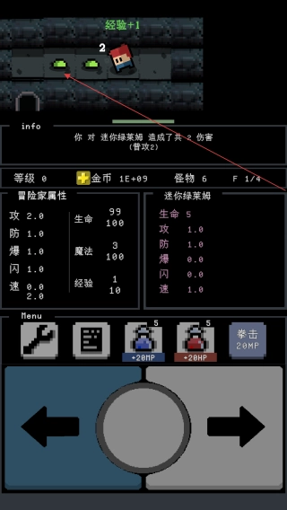 4、通过操作屏幕下方的方向摇杆来控制角色移动,在探索地牢的过程中,当遇到怪物时,要根据角色自身的属性和技能,挑选恰当的时机对怪物发起攻击,以此获取经验值来提升角色等级。