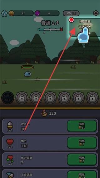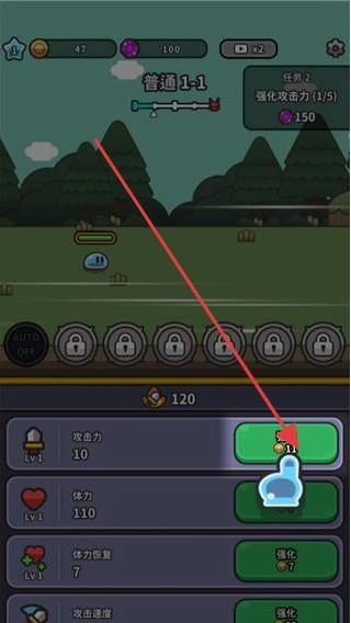 1、进入关卡界面,查看屏幕下方属性栏,点击强化按钮,花费资源提升攻击力等属性,增强角色实力。