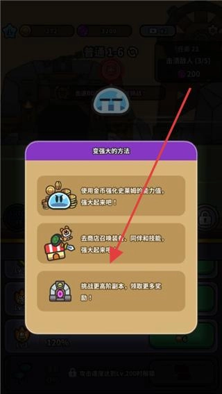 2、看到变强大的方法提示后,了解到可使用金币强化史莱姆能力值,还能去商店召唤装备、同伴和技能,以及挑战更高阶副本获取更多奖励。