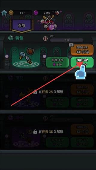 4、积攒足够资源后,点击召唤界面中的召唤35次按钮,尝试获取强力装备、同伴或技能,助力通关后续关卡。