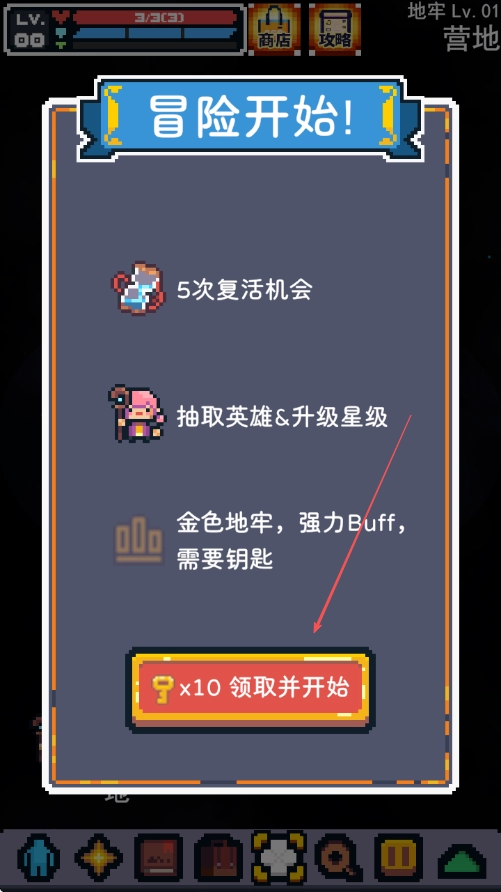 1、看到“冒险开始!”界面后,先确认自己拥有5次复活机会,接着点击x10按钮领取并消耗10把钥匙,正式开启冒险。