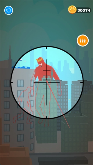 游戏采用定点射击模式,玩家无需操控角色移动,只需将注意力集中在瞄准与射击上。操作流程简化为拖动瞄准后点击射击,部分关卡还支持长按开镜以放大视野,让玩家能更专注于针对敌人弱点进行狙击的核心玩法。
