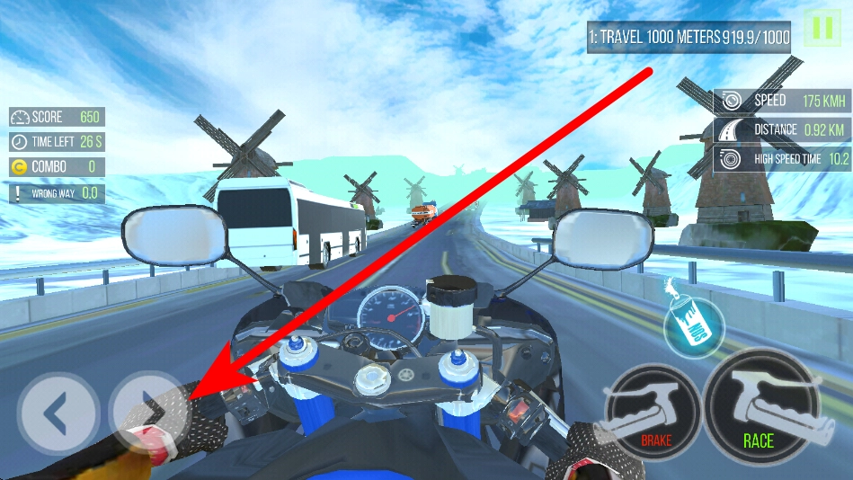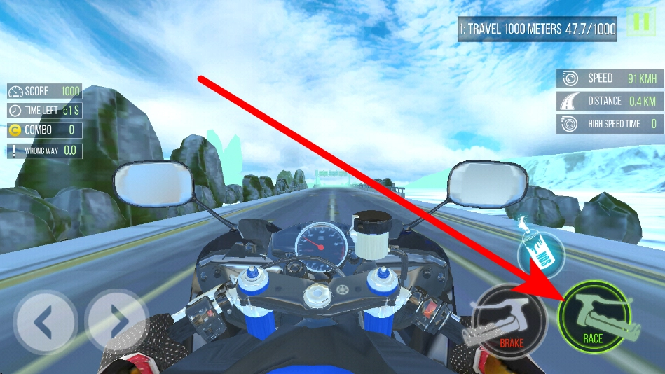 3、接着操控加速,在驾驶过程中,点击加速按钮,可提升摩托车的速度,让摩托车在道路上快速前进,感受风驰电掣的感觉。