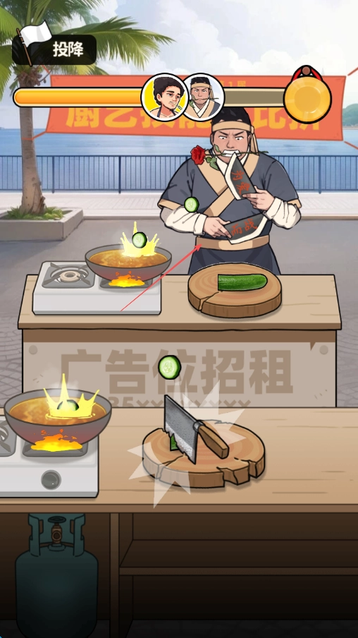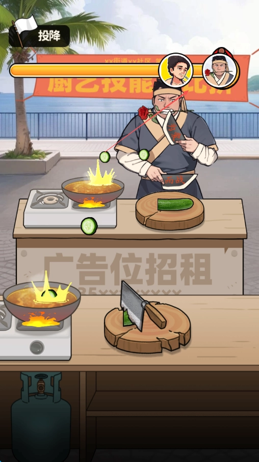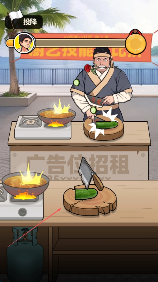 1、进入王牌食神游戏的厨艺比拼环节,看到对手在切菜时,迅速点击案板上的黄瓜来完成切片操作。