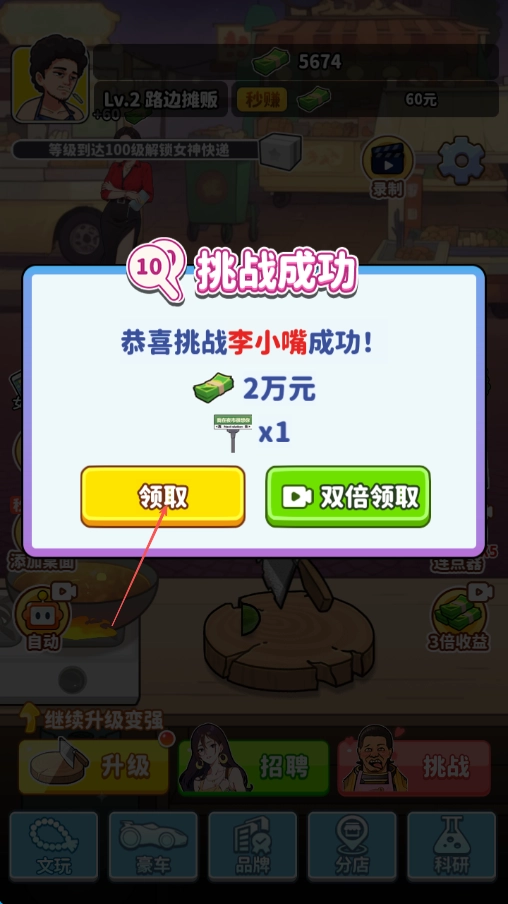 4、在比拼中成功战胜对手,看到挑战成功的提示后,点击领取按钮就能拿到奖励,也可以选择双倍领取来获取更多资源。