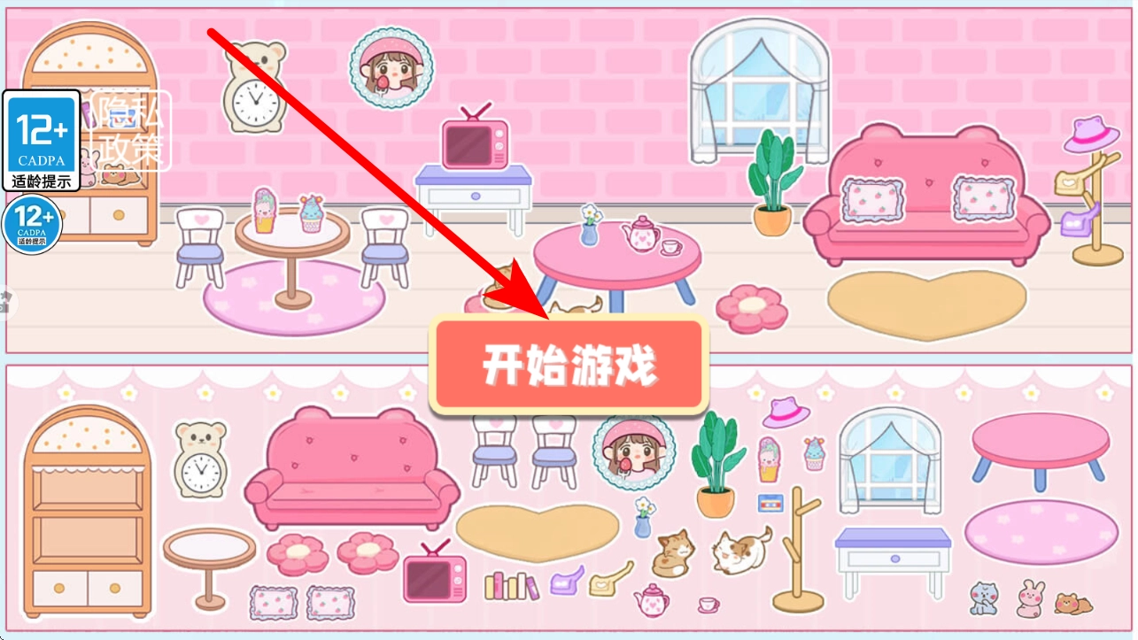 进入界面后,映入眼帘的是布满可爱装饰的画面,点击开始游戏按钮,就能进入模式选择等后续环节,开启你的装扮之旅。