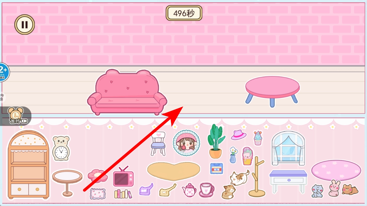 3、进入装扮界面后,下方会展示出各式各样的家具与装饰物品,比如粉色沙发、圆形茶几之类的,点击你心仪的物品,依据自己的喜好来完成房间的装扮。