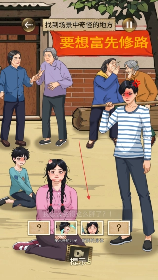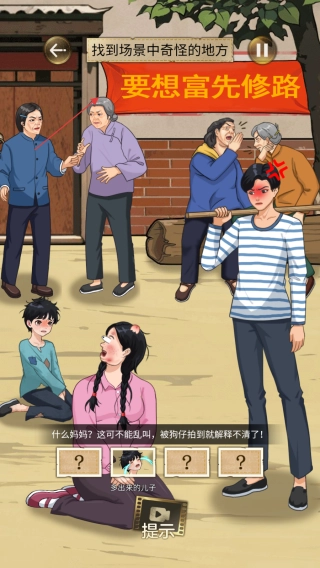3、注意墙上“要想富先修路”这类标语以及周边环境,不要遗漏任何细节,借助提示功能,找出所有异常之处以完成关卡。