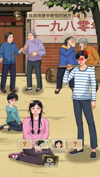 1、进入游戏后,按照场景里关于“奇怪之处”的提示,仔细观察画面细节,像男人头上那个类似卍字的红色印记,点击你觉得可疑的地方来寻找奇怪点。