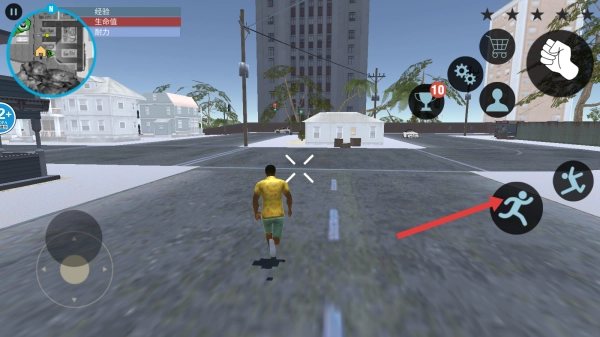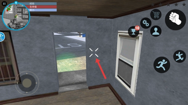 1、在房子里面的情境,用左侧摇杆移动,右侧按键攻击或者跑步,按小地图左上指引,初始安全点。