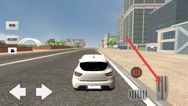 1、进入游戏后,点击右侧油门踏板,来进行控制汽车加速行驶,开启城市驾驶自由探索。
