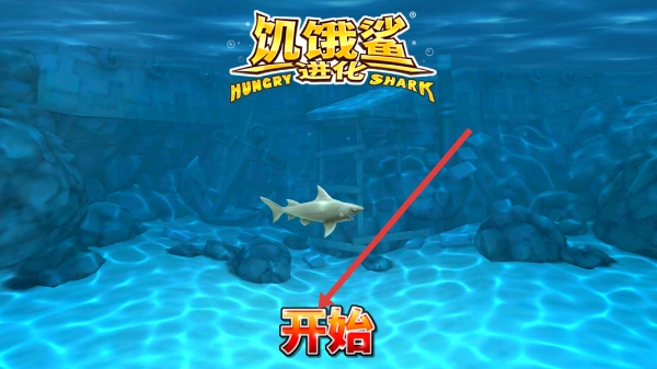 1、在《饥饿鲨:进化》的初始界面里,找到红色箭头所指向的位置,点击开始按钮,即可进入游戏控制说明页面。