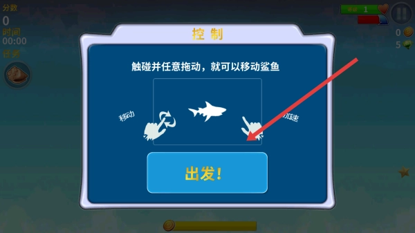 2、阅读完控制指引,通过触碰拖动操作移动鲨鱼后,再按照指示点击出发按钮,就能进入游戏主场景了。