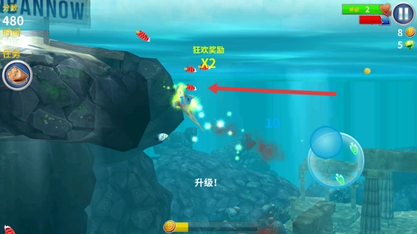 3、游戏过程中,玩家可通过滑动屏幕来操控鲨鱼的移动方向,使其捕食小鱼等目标,以此获取分数并提升等级,从而推动游戏进程不断向前。