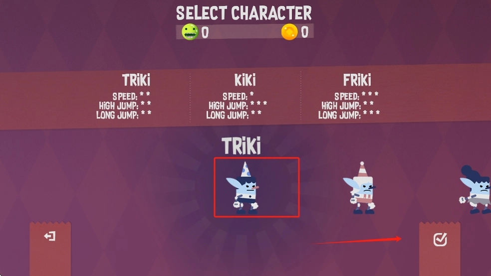 1、进入角色选择界面后,根据关卡的具体要求挑选Triki——该角色的速度与跳跃属性能够很好地适配需求,接着点击界面右侧的勾选按钮,确认选择后即可进入游戏。