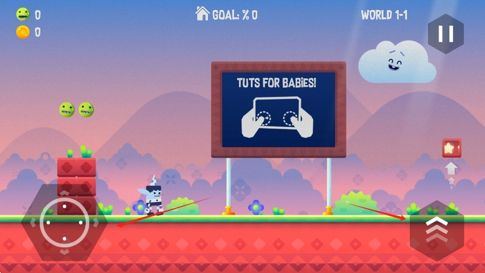 2、进入1-1关卡,通过左侧摇杆控制角色移动,借助右侧按键完成跳跃,避开绿色敌人,跟随场景的推进节奏行动,注意关注界面提示,成功抵达终点即可。