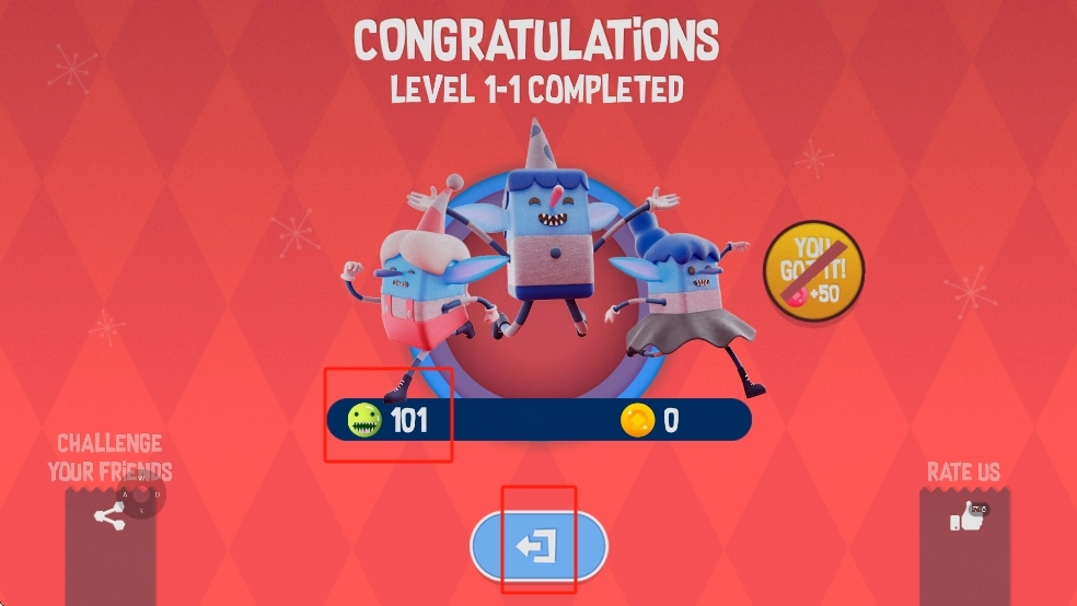 3、通关后的界面会呈现击败101个敌人之类的数据,点击界面中间的蓝色箭头按钮,就能回到选关页面,或者进入下一关继续进行挑战。