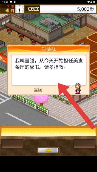 2、界面弹出对话框,玩家嘉膳会自我介绍将担任餐厅秘书,点击对话框即可进入下一步操作。