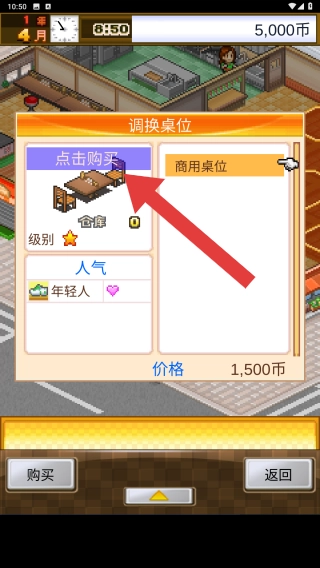 3、界面:在调换桌位界面中,通过点击购买仓屋、商用桌位等桌位类型,可增添餐厅的用餐区域。