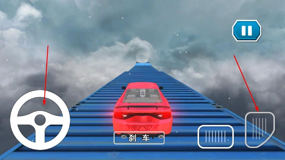 2、游戏进行时,可通过左侧的虚拟方向盘来操控车辆的行驶方向,同时利用刹车和油门踏板来调节车速,从而在高空赛道上保持平稳行驶。