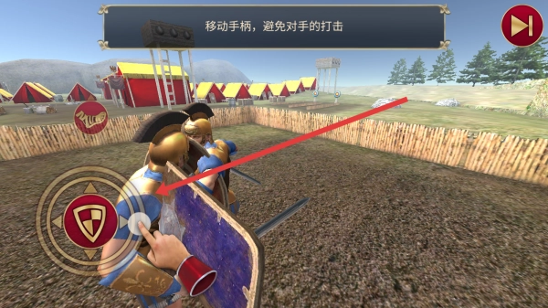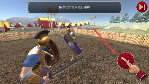 1、在战斗刚开始的时候,点击攻击按钮就能出击,借助武器攻击对方,从而启动角斗士的战斗流程。