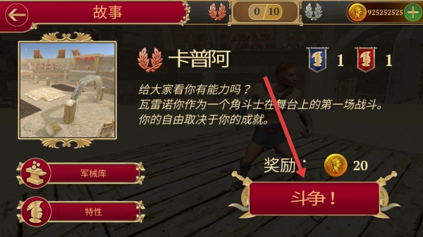 3、完成教学环节后,进入故事关卡界面,点击斗争按钮,开启瓦雷诺作为角斗士的首场战斗并获取奖励。