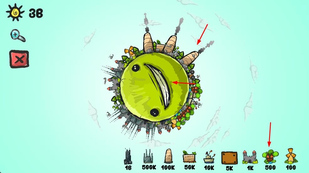 2、在底部挑选符合对应数值要求的建筑,像标有100、500、1K等标识的那些,把它们建造在绿色星球上,以此让星球的景观更加丰富。