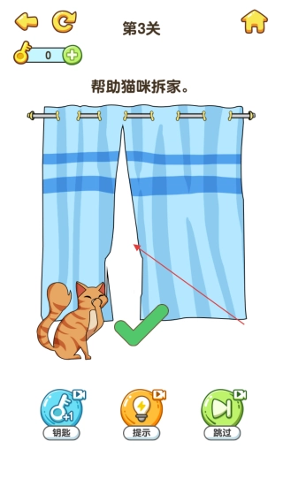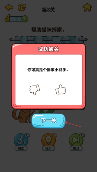 3、当猫咪成功完成拆家并出现绿色对勾标志后,点击弹出的下一关按钮,即可进入下一个关卡进行挑战。