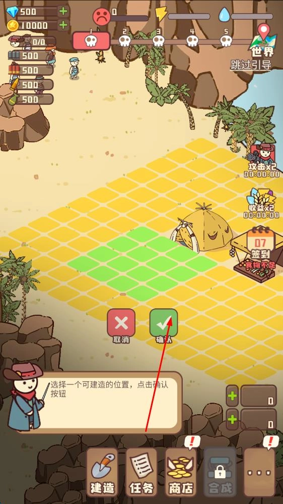 1、进入游戏后,点击“建造”按钮开启村庄建设,优先建造营帐提供住宿、蒸汽发电机保障能源,在沙盒方格中规划布局,确保建筑位置合理,为后续发展奠定基础。